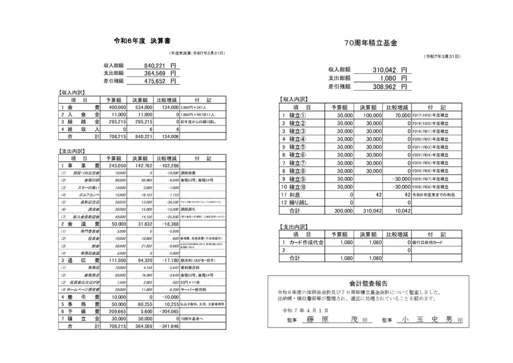 令和6年度の会計決算書・70周年積立基金・会計監査報告/令和7年度会務事業計画・予算書を掲載しました