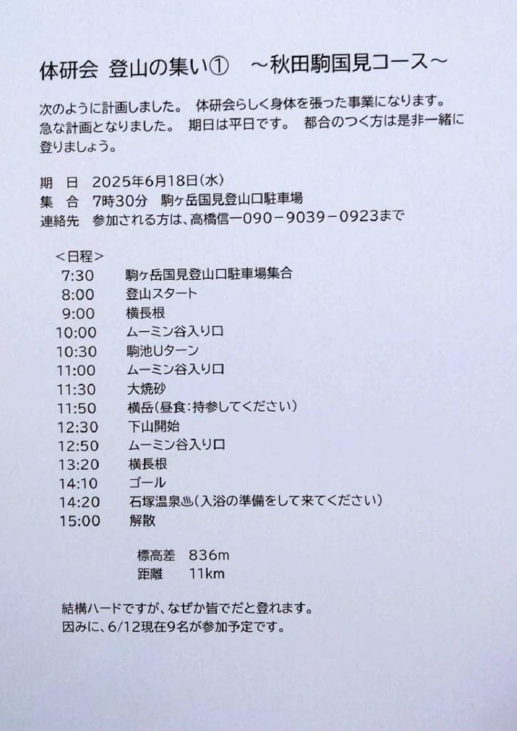 新事業の「登山の集い」の案内です。期日が迫っていますので、参加できる方はお急ぎください。