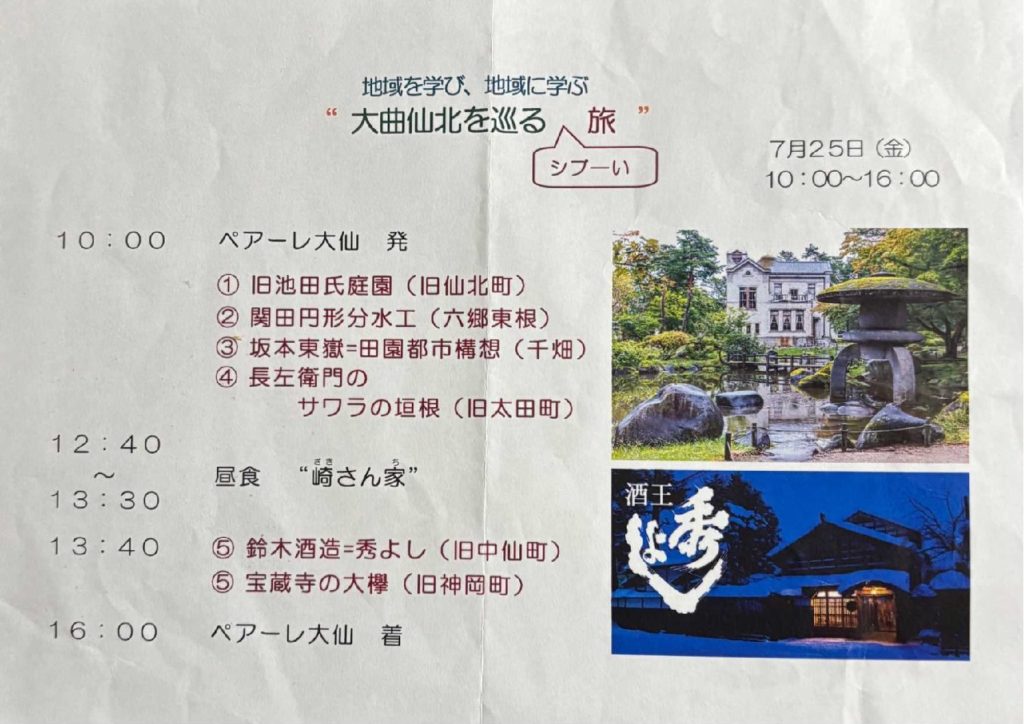 大曲仙北にある歴史や自然的な財産、銘酒「秀よし」の蔵元鈴木酒造を3台の車に分乗して訪れました。